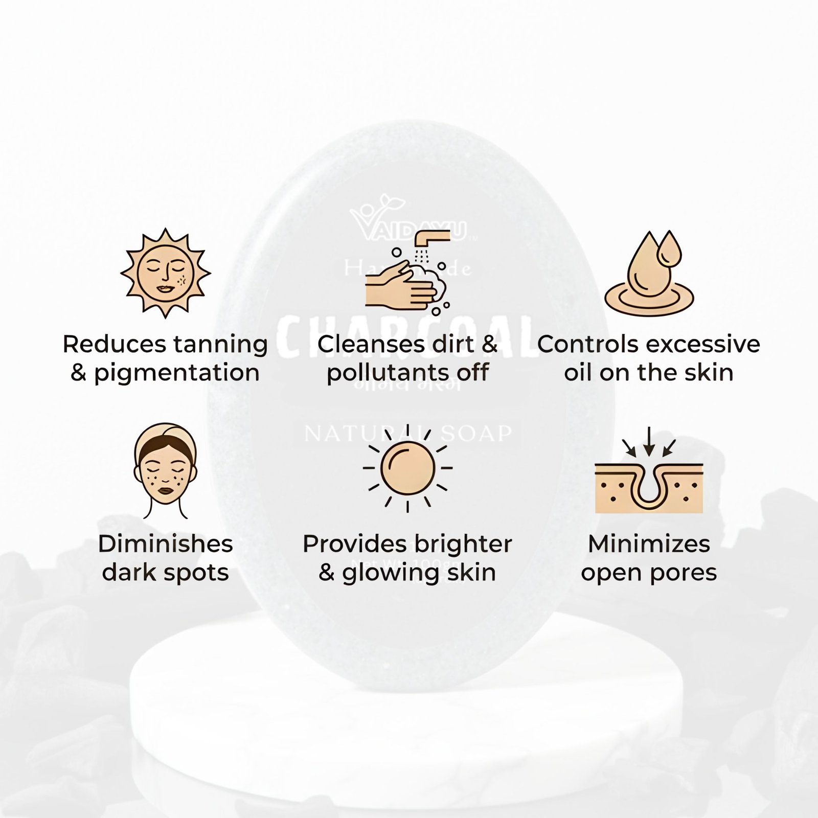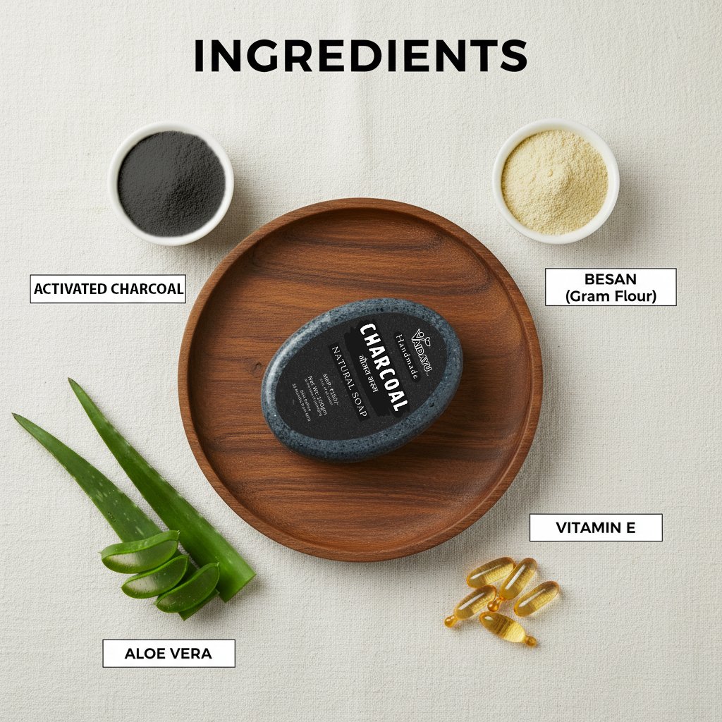 Vaidayu Natural Handmade Charcoal Soap is crafted with carefully selected natural ingredients to provide gentle and refreshing daily skin cleansing. Infused with activated charcoal, this handmade bath soap helps remove dirt, excess oil, and impurities from the skin’s surface, leaving it feeling clean, smooth, and refreshed after every wash.